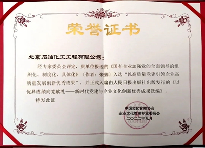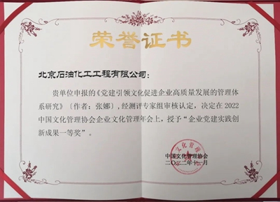 北京石油化工工程有限公司榮獲“黨建強(qiáng)企優(yōu)秀案例一等獎”。另外,公司黨委申報的2021年度和2022年度兩篇黨建和企業(yè)文化研究成果獲獎:《黨建引領(lǐng)文化促進(jìn)企業(yè)高質(zhì)量發(fā)展的管理體系研究》榮獲“企業(yè)黨建實踐創(chuàng)新成果一等獎”;《國有企業(yè)加強(qiáng)黨的全面領(lǐng)導(dǎo)的組織化、制度化、具體化》入選“以高質(zhì)量黨建引領(lǐng)企業(yè)高質(zhì)量發(fā)展創(chuàng)新優(yōu)秀成果”,并正式入編由人民日報出版社出版發(fā)行的《以優(yōu)異成績向黨獻(xiàn)禮——新時代黨建與企業(yè)文化創(chuàng)新優(yōu)秀成果選編》。