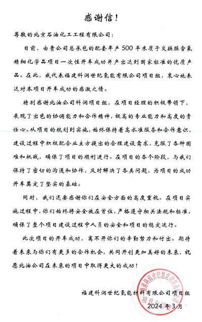 近日,北京石油化工工程有限公司收到福建科潤世紀(jì)氫能材料有限公司發(fā)來的感謝信,對我公司在負(fù)責(zé)配套年產(chǎn)500平米質(zhì)子交換膜含氟精細(xì)化學(xué)品項目期間,出色的協(xié)調(diào)能力和合作精神,極高的專業(yè)能力和高度的責(zé)任心給予了高度評價。