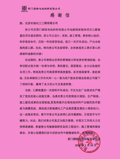 1月26日,北京石油化工工程有限公司(簡稱:北油工程)總承包的荊門源晗乙醇裝置一次性開車成功,順利產出合格高純度乙醇,標志著該項目建設任務圓滿收官、實現階段性重大突破。荊門源晗特向北油工程發(fā)來感謝信,對公司各級領導及項目團隊在裝置建設期間的傾力支持、卓越管理和辛勤付出,致以衷心感謝與誠摯問候。